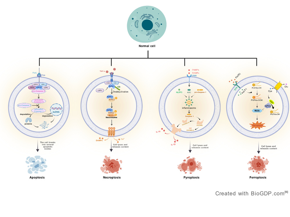细胞有多种不同死亡方式,包括凋亡、坏死性凋亡、焦亡和铁死亡等,它们受基因精密调控,就像不同的“删除指令”,在不同的情况下激活,执行不同的任务[2]。
